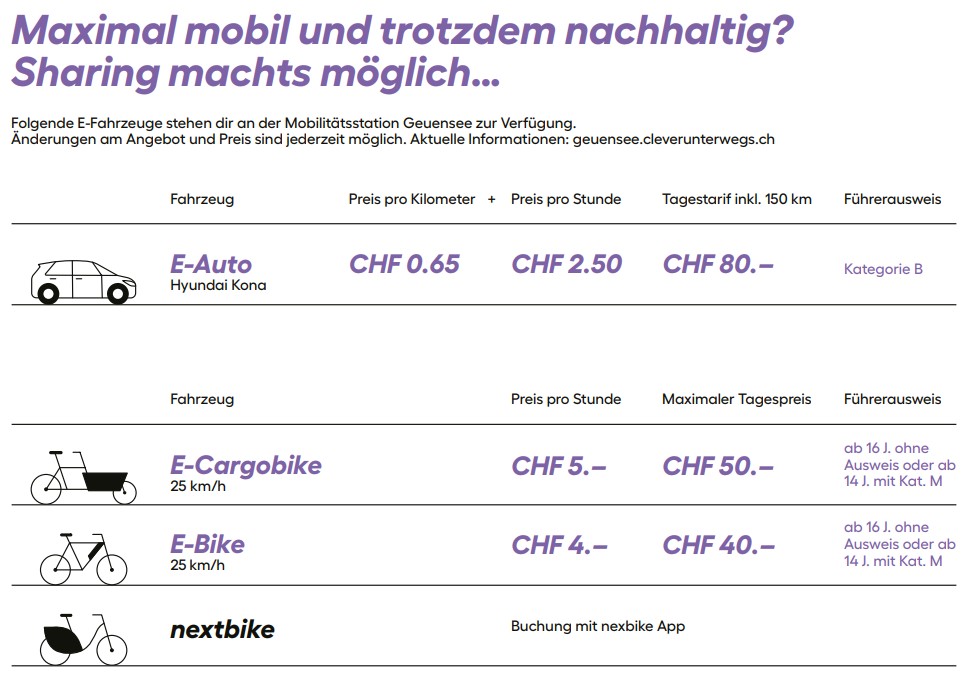 Die Mobilitätsstation beim alten Schulhaus, ausgestattet mit einem E-Auto, einem E-Cargobike und zwei E-Bikes, ist ein gemeinsames Projekt der Gemeinde Geuensee und der Albert Koechlin Stiftung. Die Sharing-Fahrzeuge stehen rund um die Uhr bereit, damit jedermann unkompliziert seine Ziele erreicht. Die Mobilitätsstation macht ein mobiles Leben leichter – ohne alle Fahrzeuge besitzen zu müssen. Mit einer einzigen App kann man reservieren, öffnen, schliessen und die Nutzung der Fahrzeuge bezahlen.